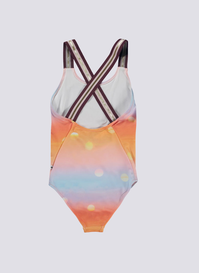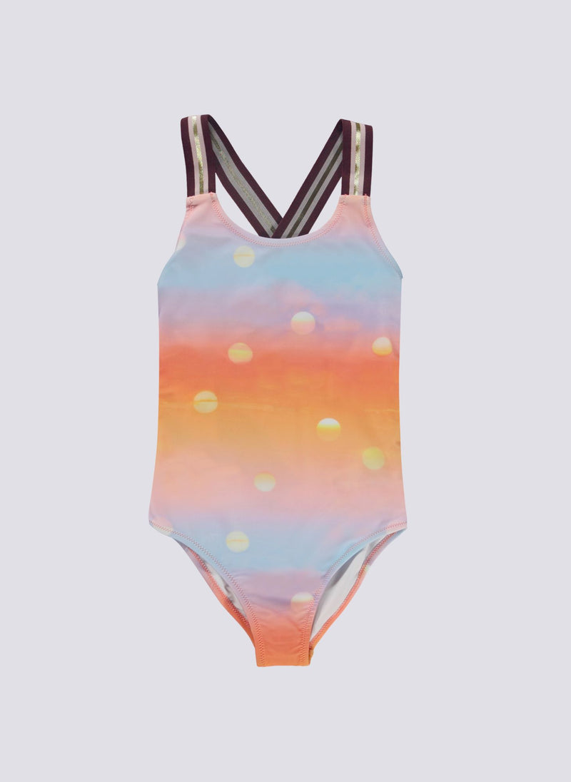 Neve is a classic swimsuit in light blue and orange with small suns. It has wide straps that cross on the back. Molo's swimwear has 50+ UV protection. This Molo product is recycled and made from REPREVE reusable polyester. REPREVE is the leading, most trusted brand in reusable fibres and is made from used plastic bottles and other waste materials. The production of recycled polyester utilises far fewer resources and emits less CO2, making Molo’s recycled swimwear a sustainable choice