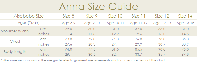 - For example, Aisabobo size 8 should fit well for an average measurements (height, chest, waist) 8-year-old in her age group.