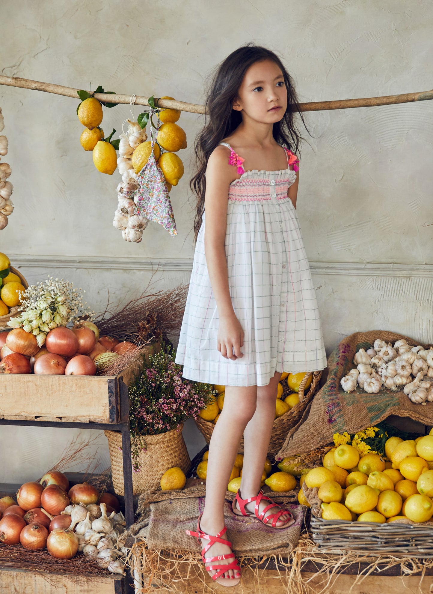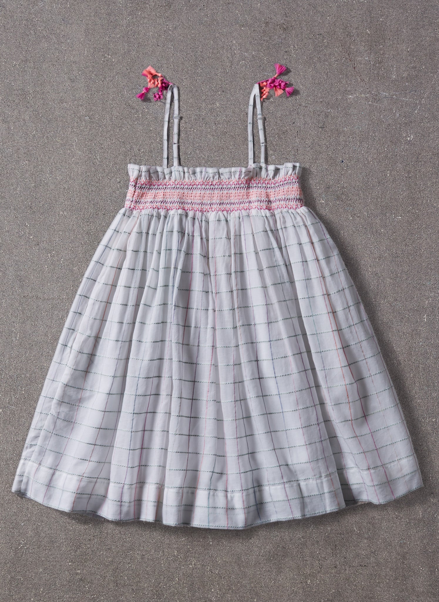 Delightfully pretty sun dress made in 100% fine cotton. There are adjustable shoulder straps and layered pom pom, with an elasticated smocked bodice.