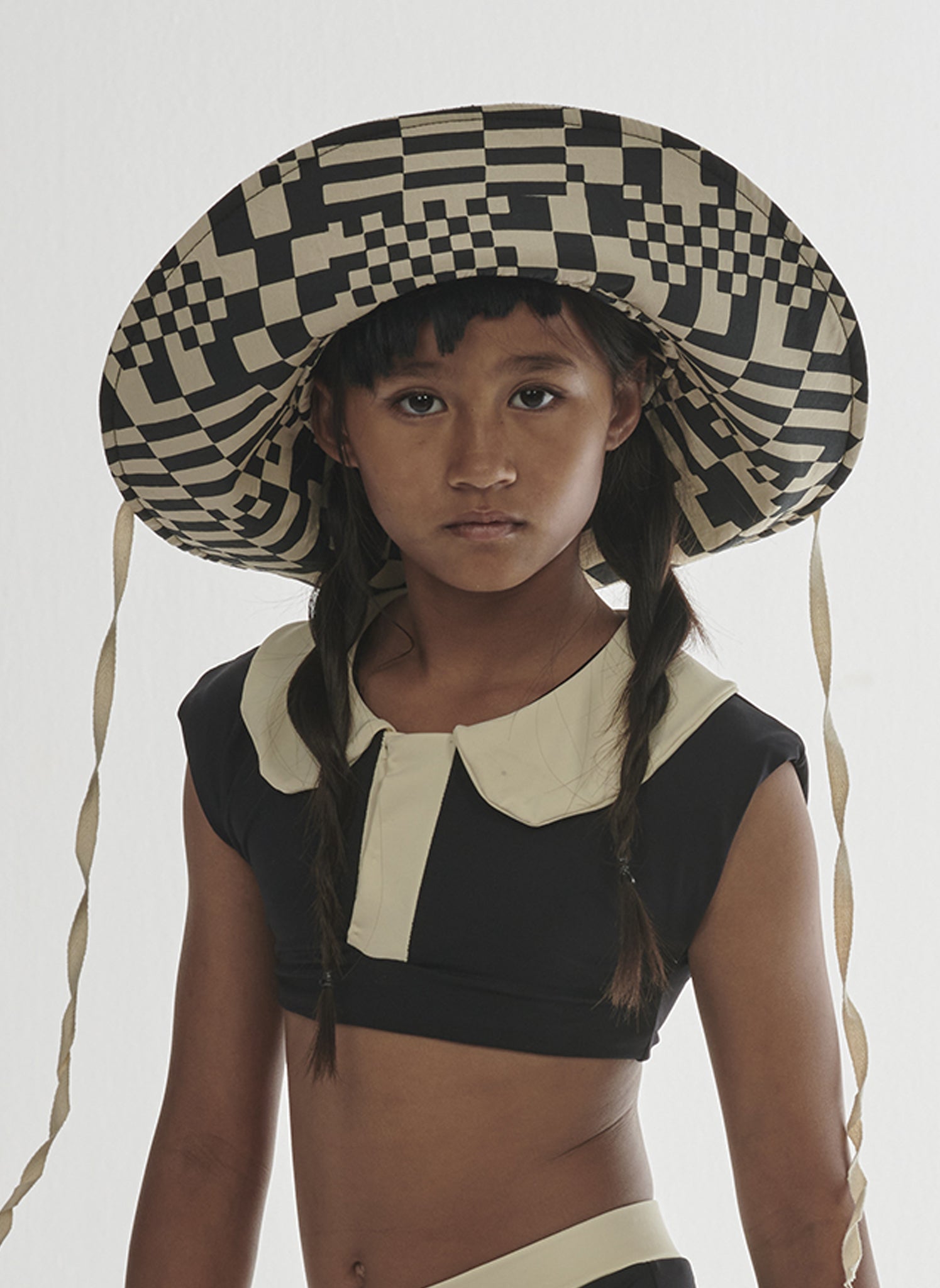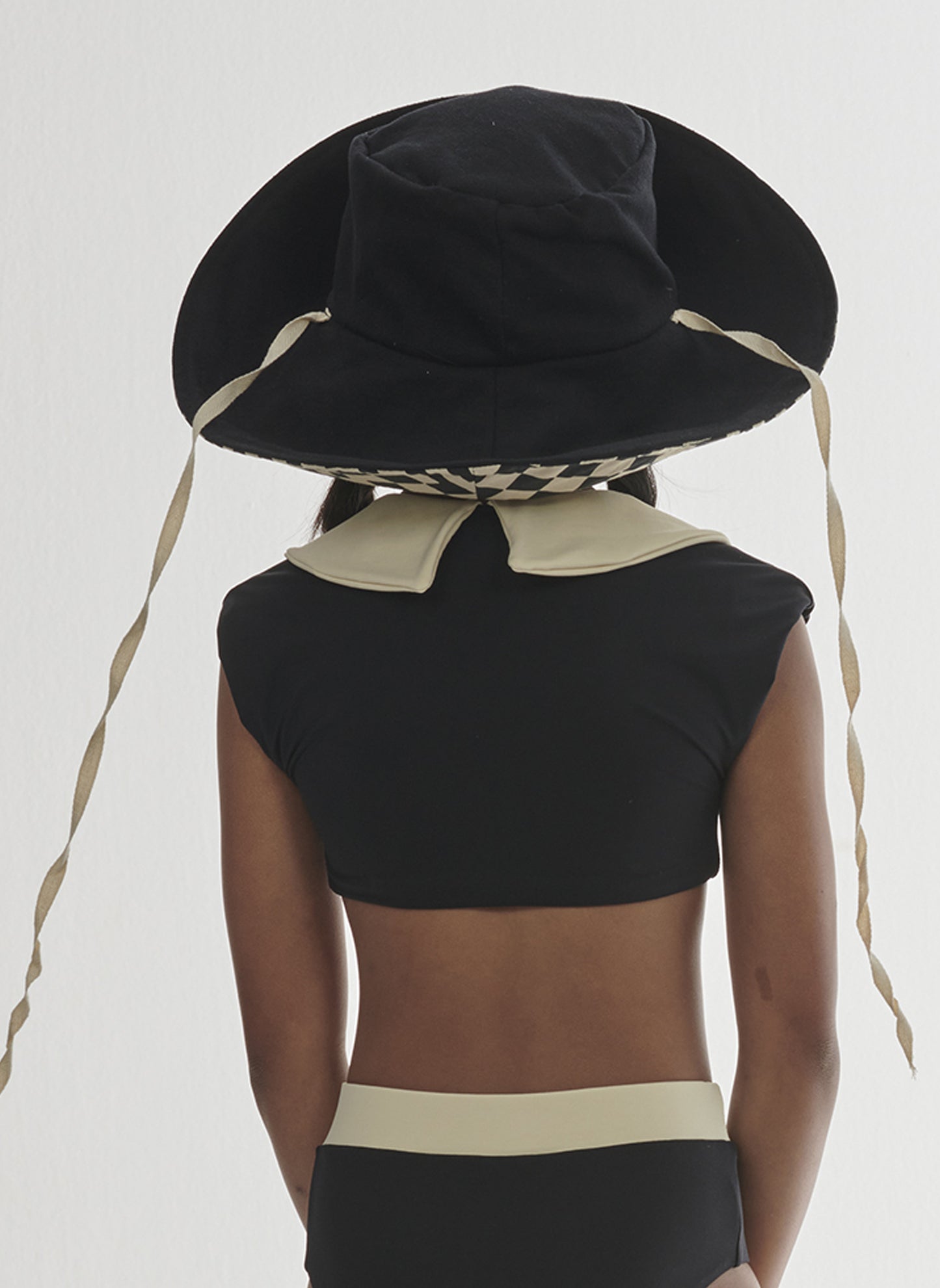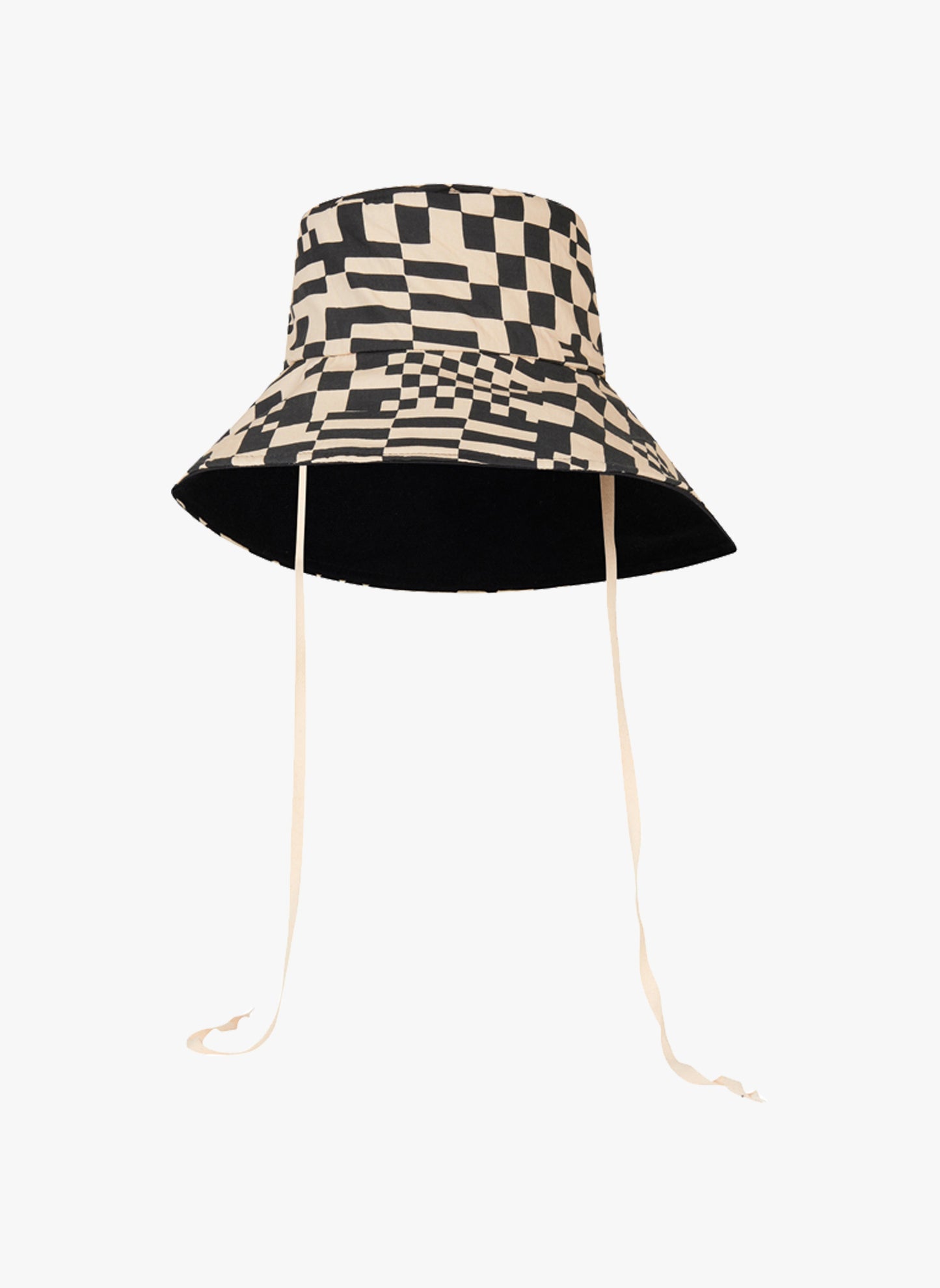- Reversible cotton canvas hat in plain black and bold cream and black print. Oversize brim with ribbon knot.