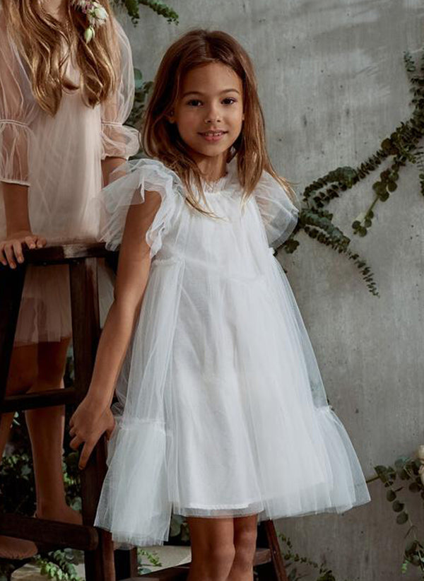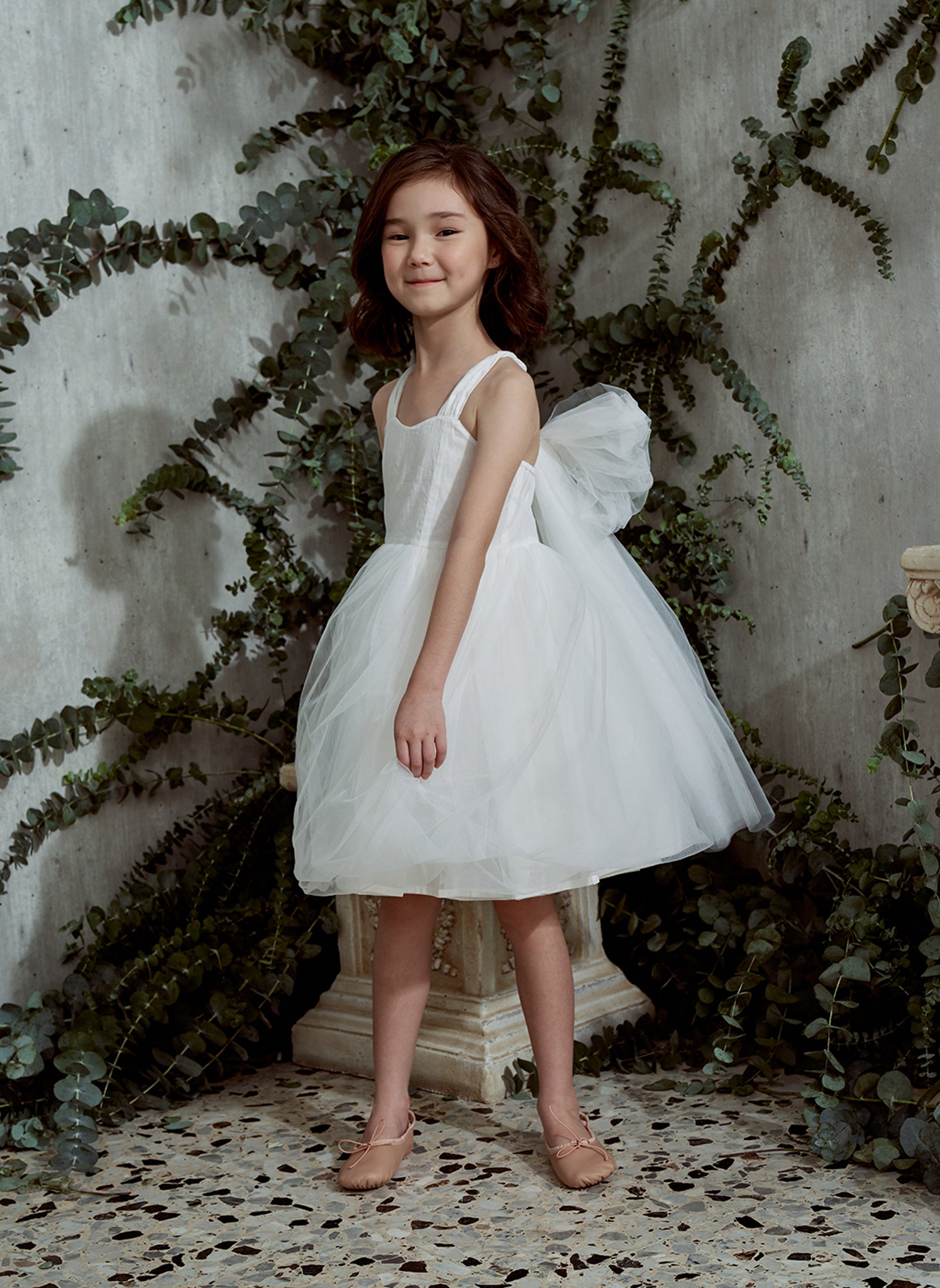 SS21 100% cotton dress with a tulle overlay and a pretty back bow.