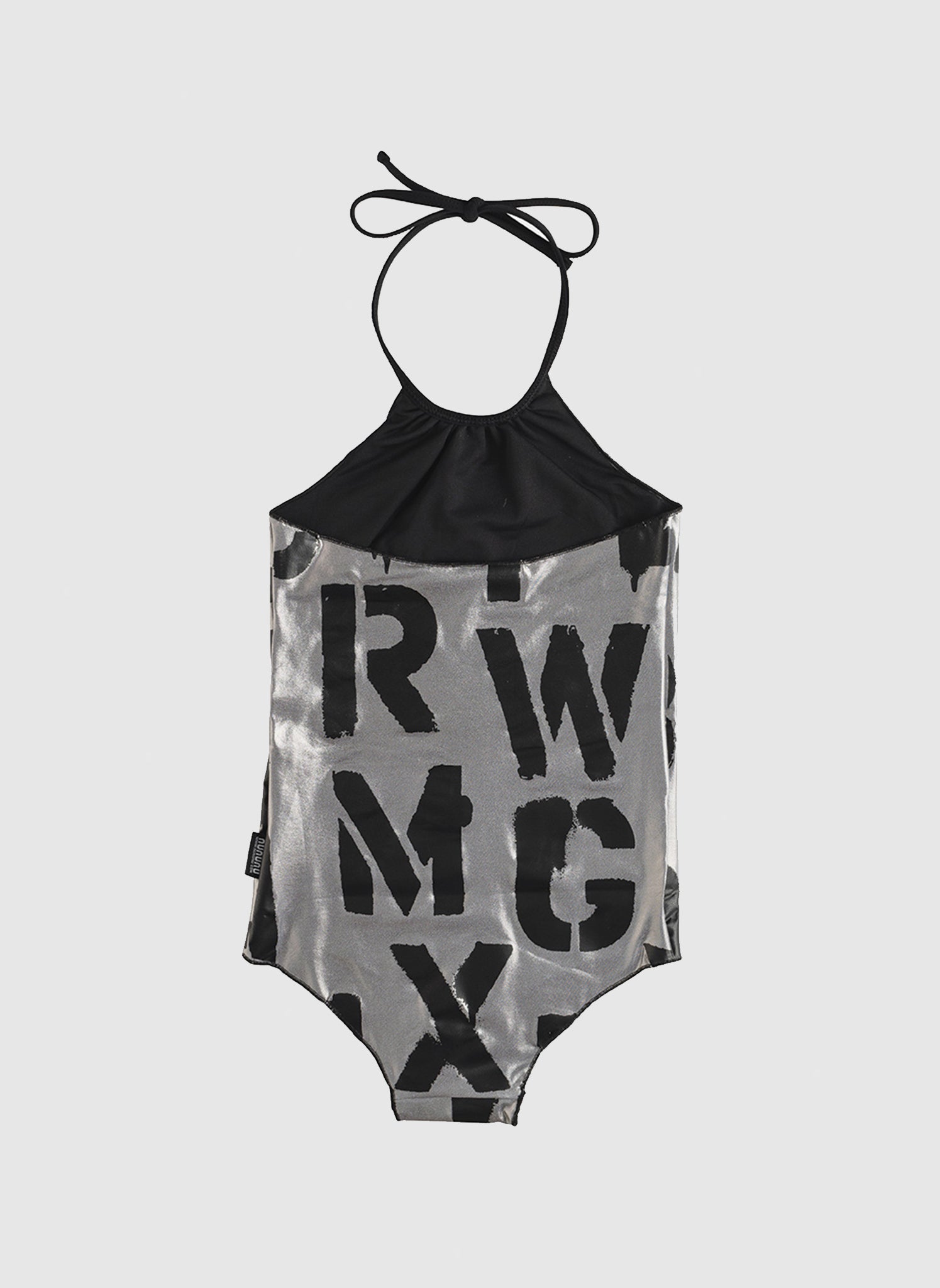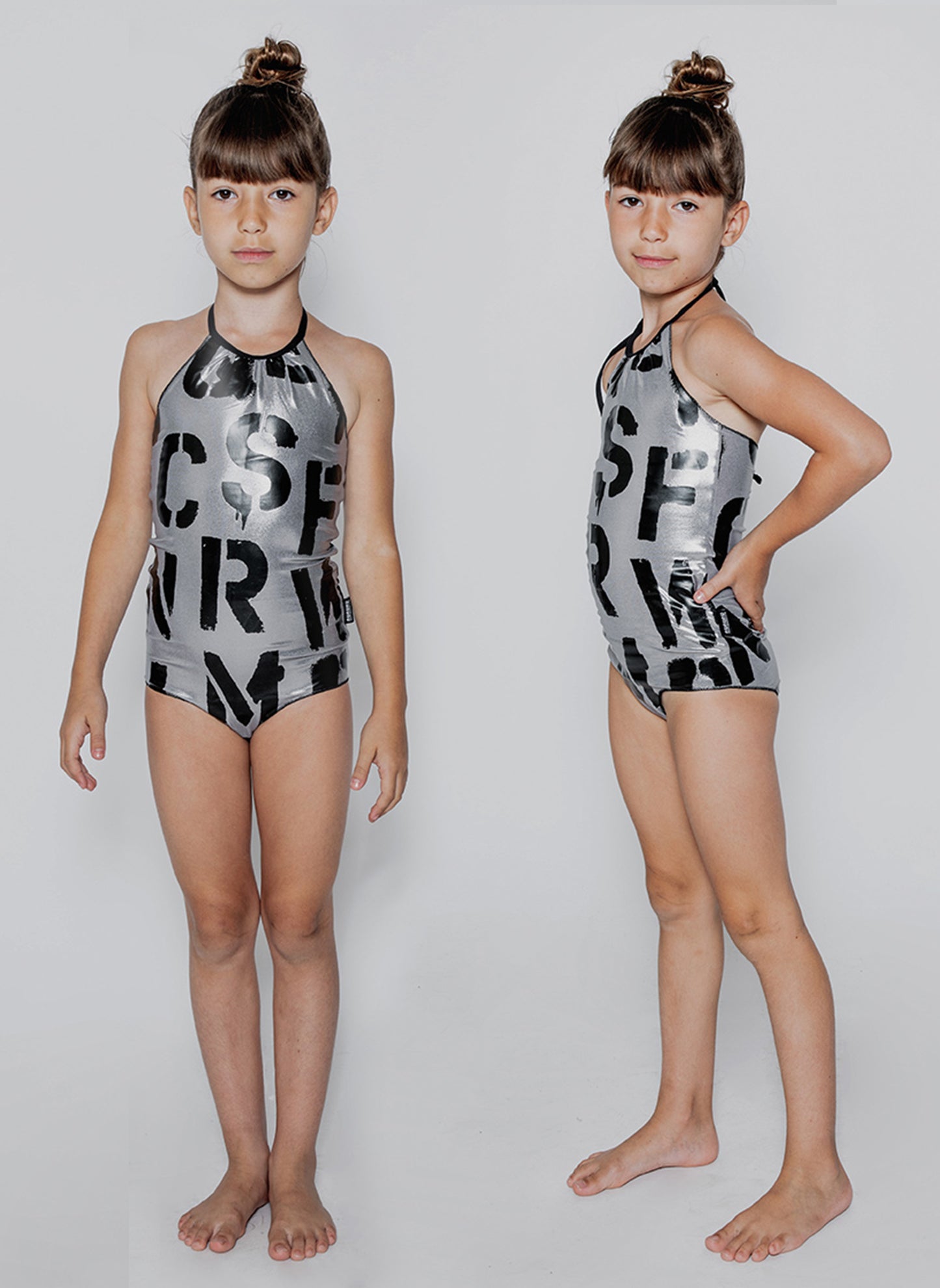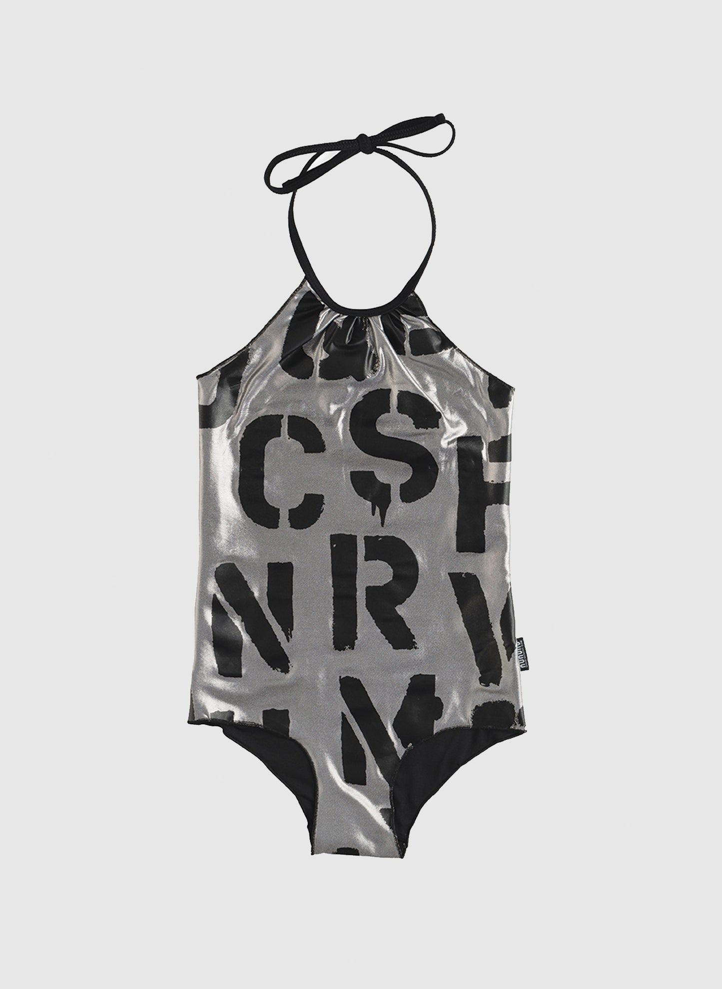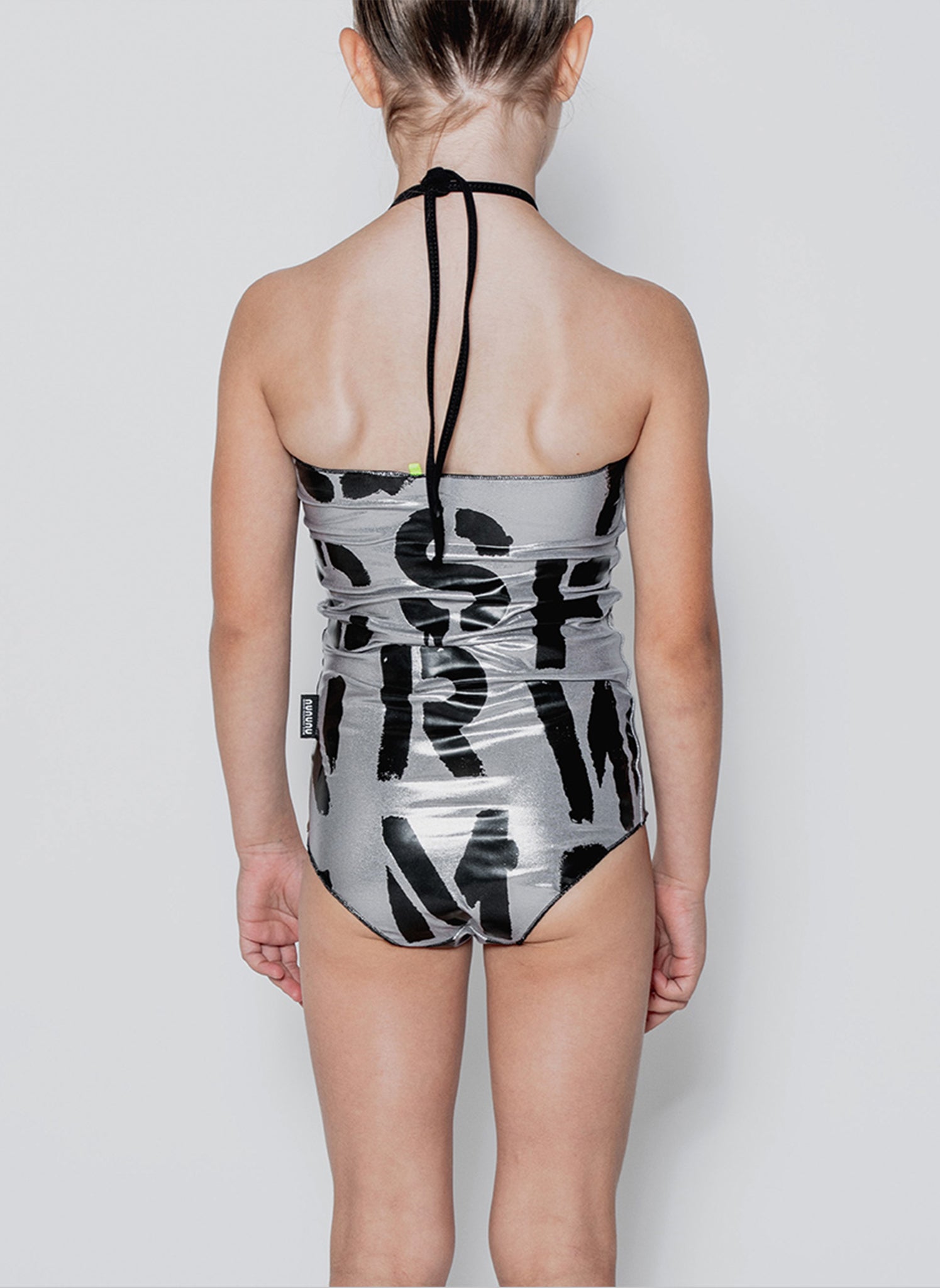 This silver swimsuit for girls is flashy & nerdy at the same time. since we think nerds are cool, we put drippy, stenciled letters all over it. our super shiny, slinky foil material is the backdrop, adding major style points to this classic-cut poolside hit. a high halter neck ties in back. style her with pants or a skirt for a halter-top look.