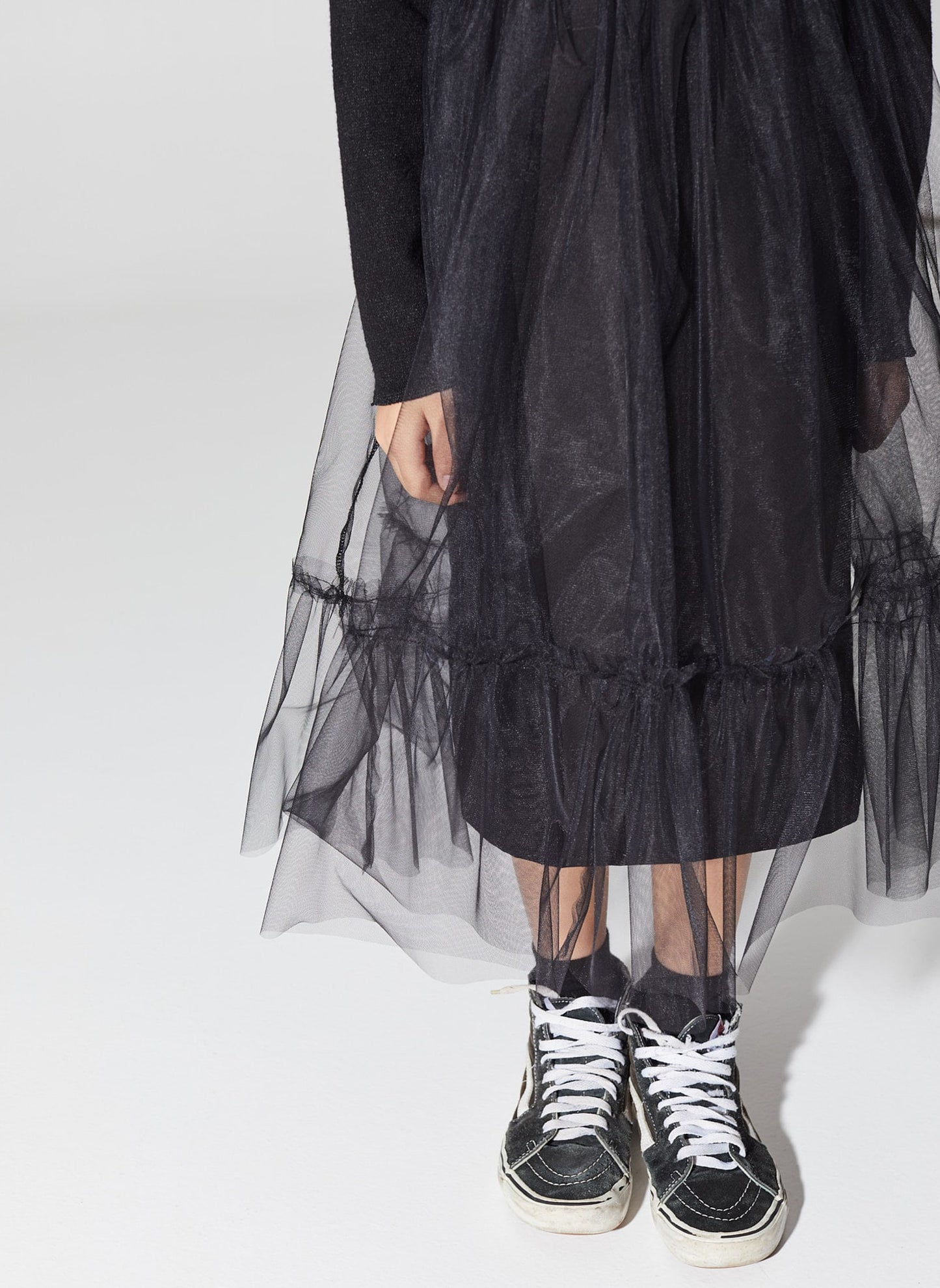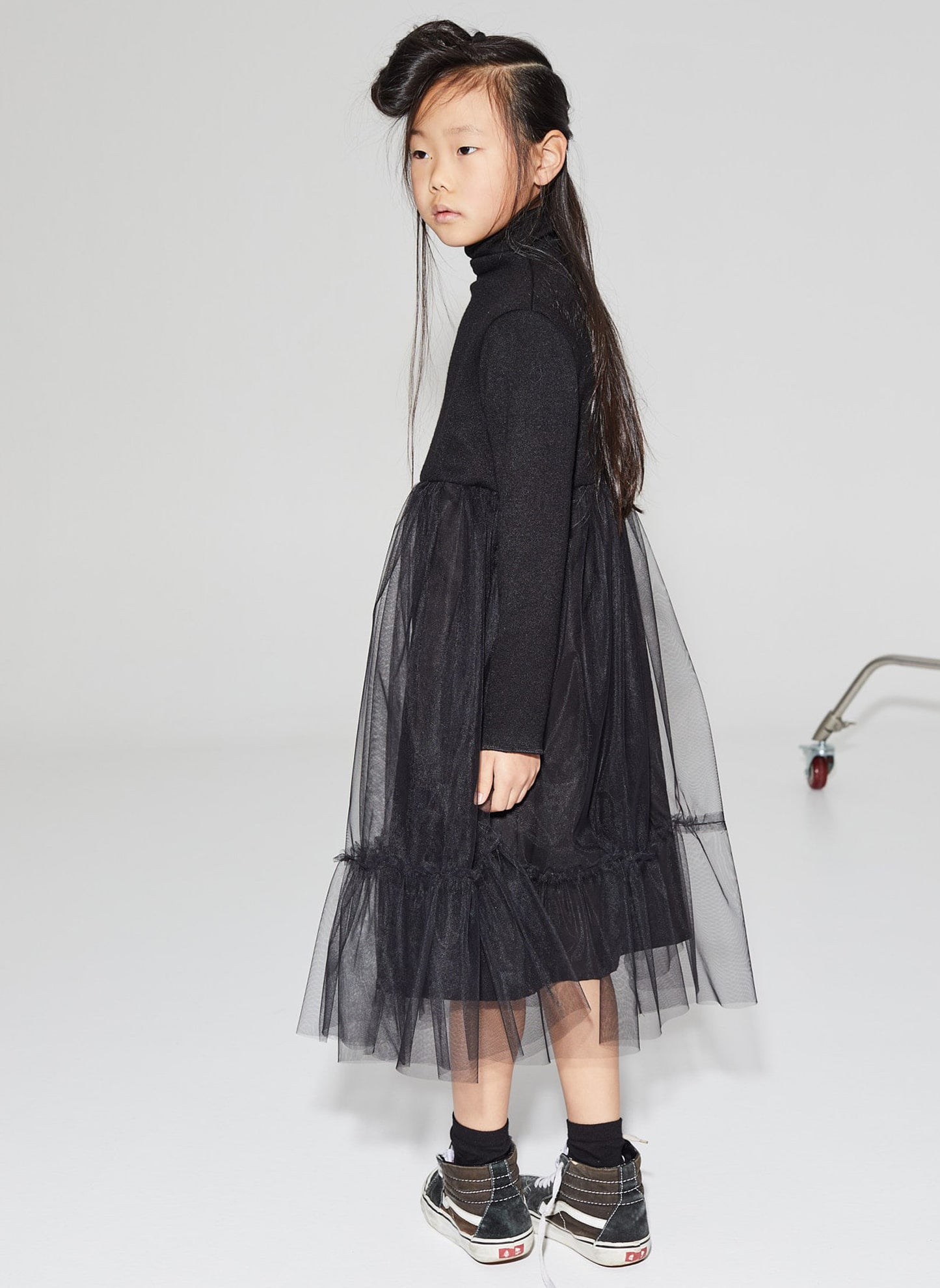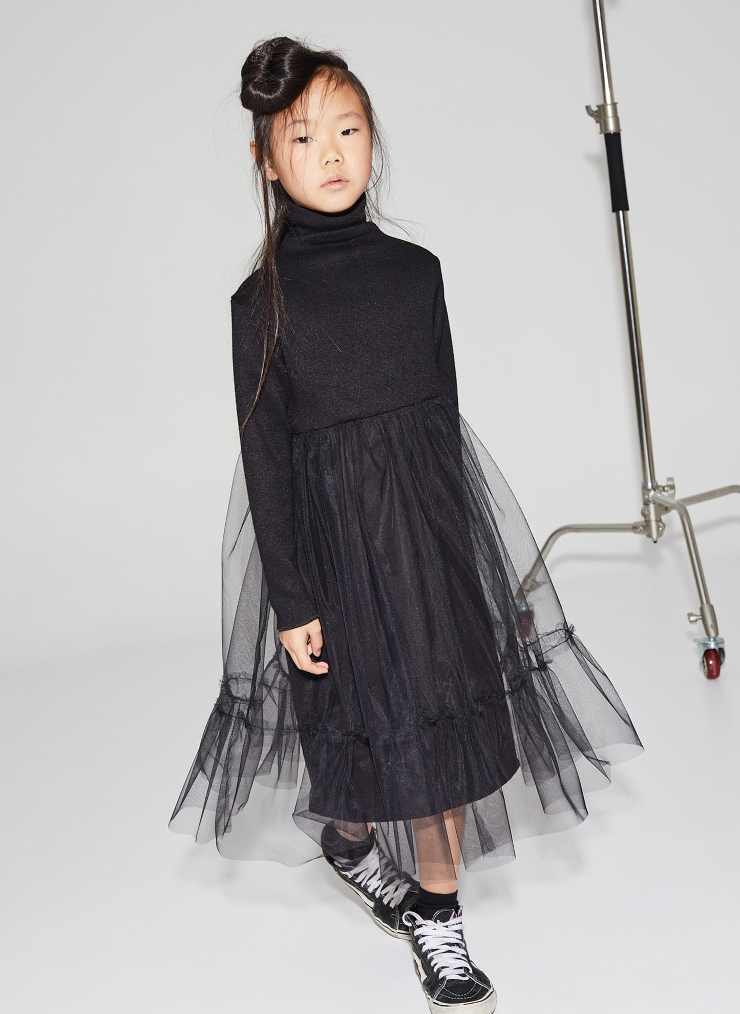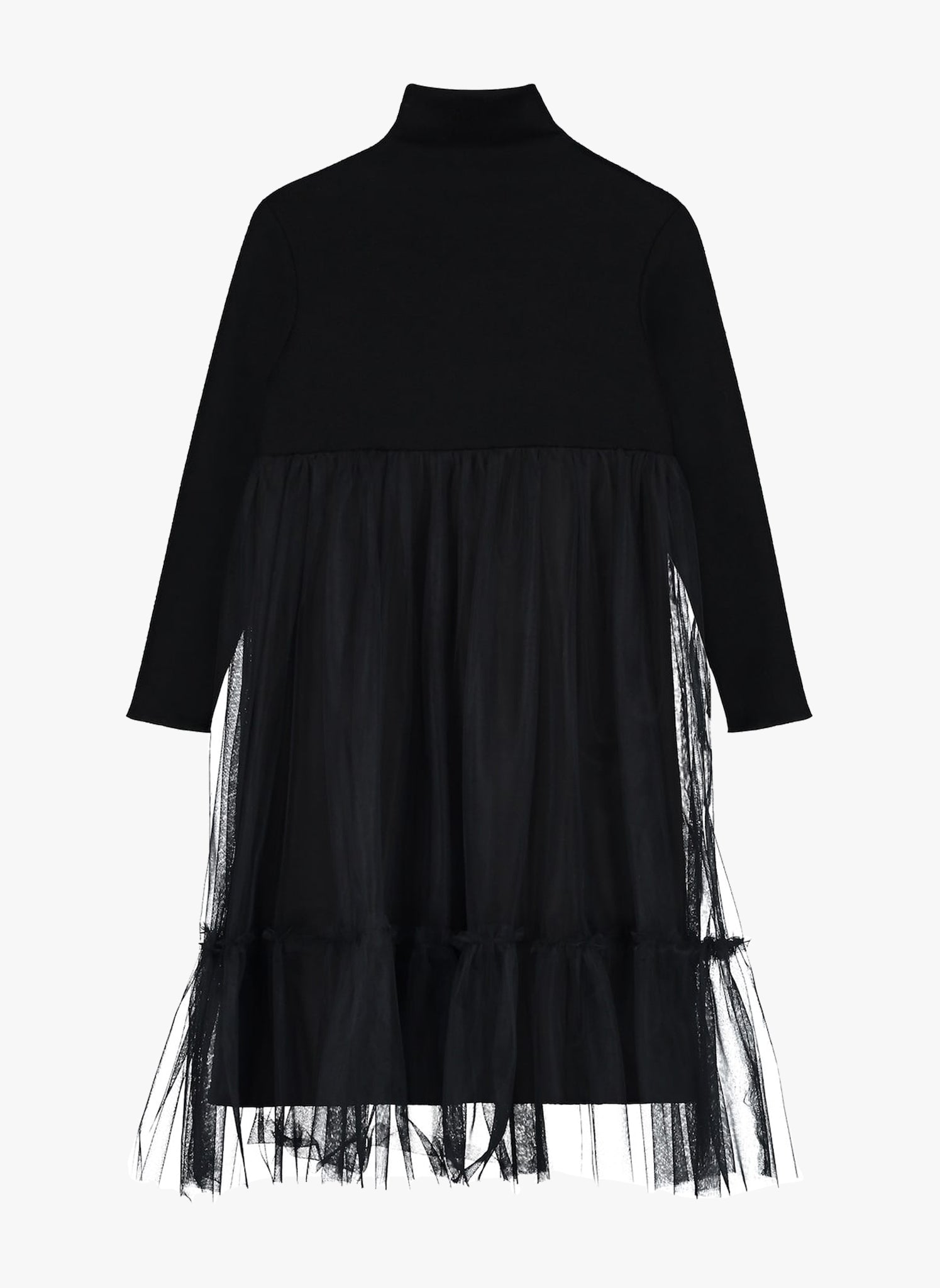 Glaring Dress, a sleek and delicate masterpiece. This dress combines a turtle neck and a pristine black top, meticulously crafted for a sleek and modern look. The midsection is artfully cut, accentuating the waistline, while the black flowing tulle detail adds a touch of elegance and grace. Embrace an enchanting and sophisticated style with this stunning dress.