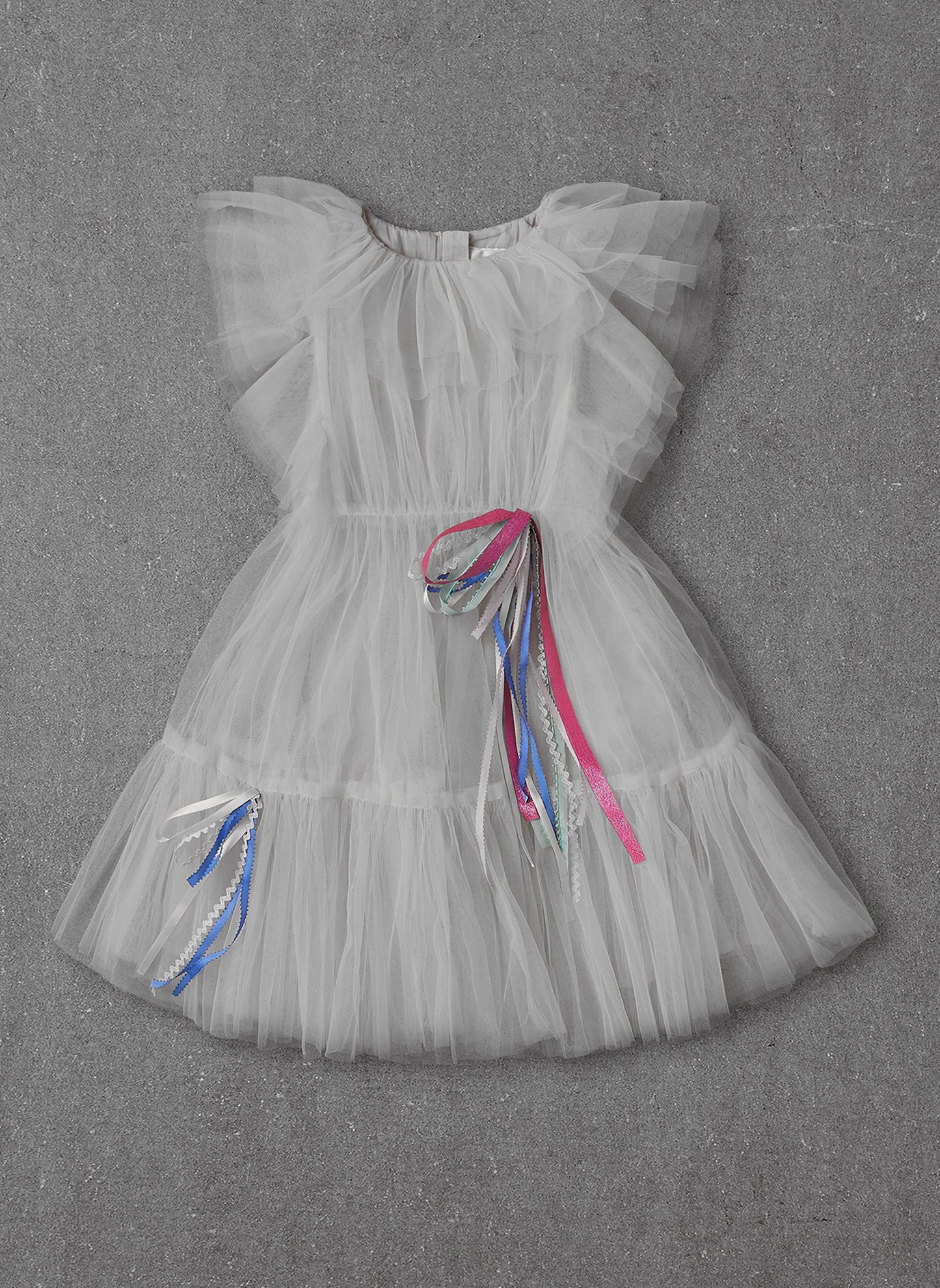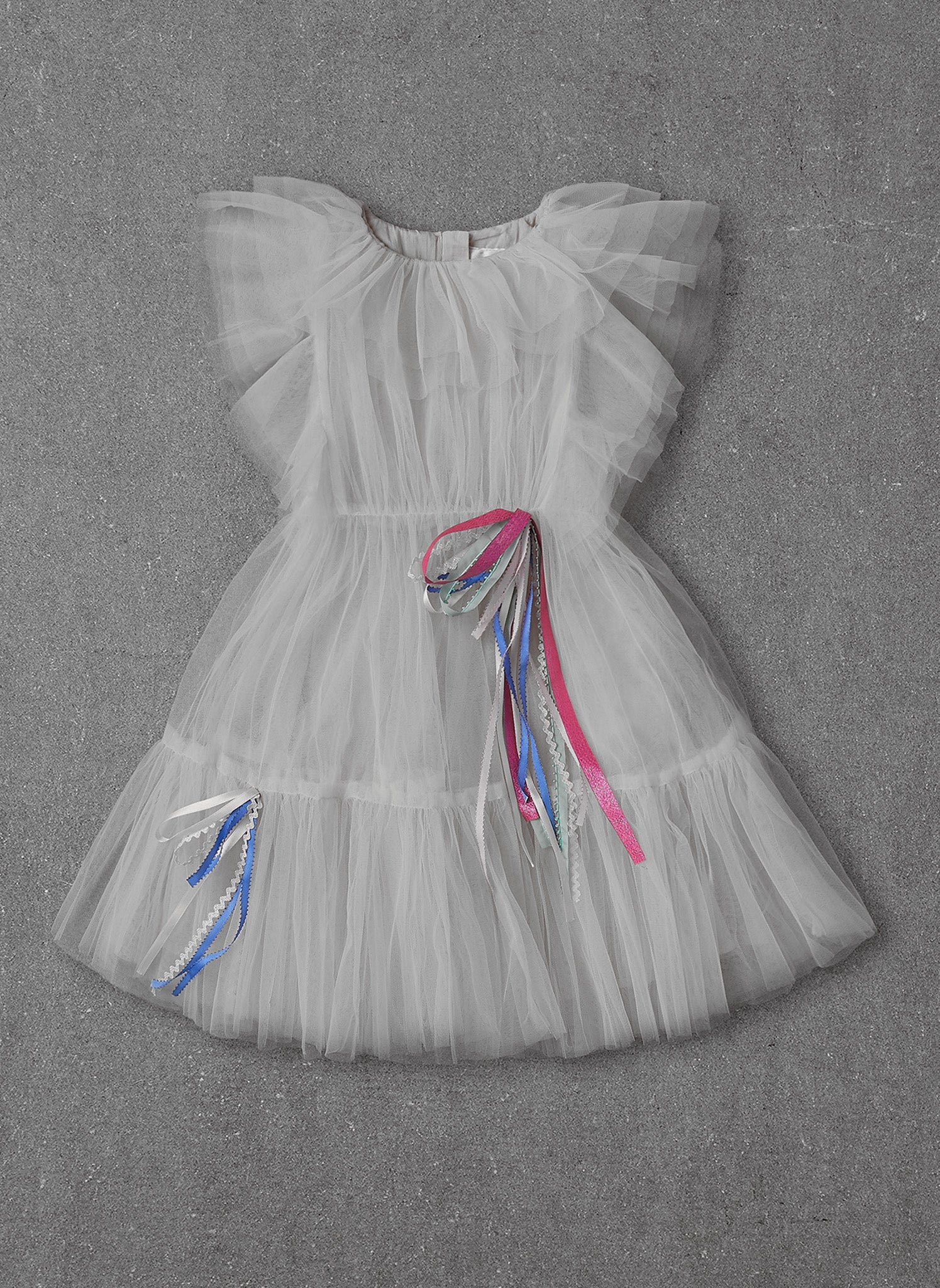 Whimsical multi-layered tulle dress with fanciful ribbons on dress front.