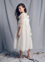 Nellystella has designed a mid-length formal girls dress for that special occasion with double puffed sleeves, ruched bodice, and whimsical embroidery on back ribbons. 100% nylon, cotton lined, machine wash, lay flat to dry, steam.