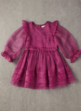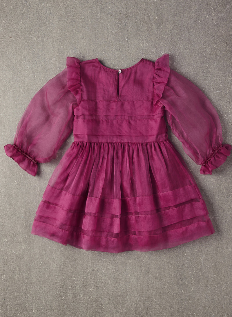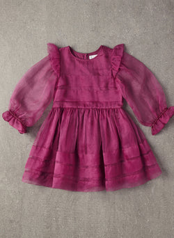 100% silk organza pleated dress with balloon sleeves in Dahlia Mauve.