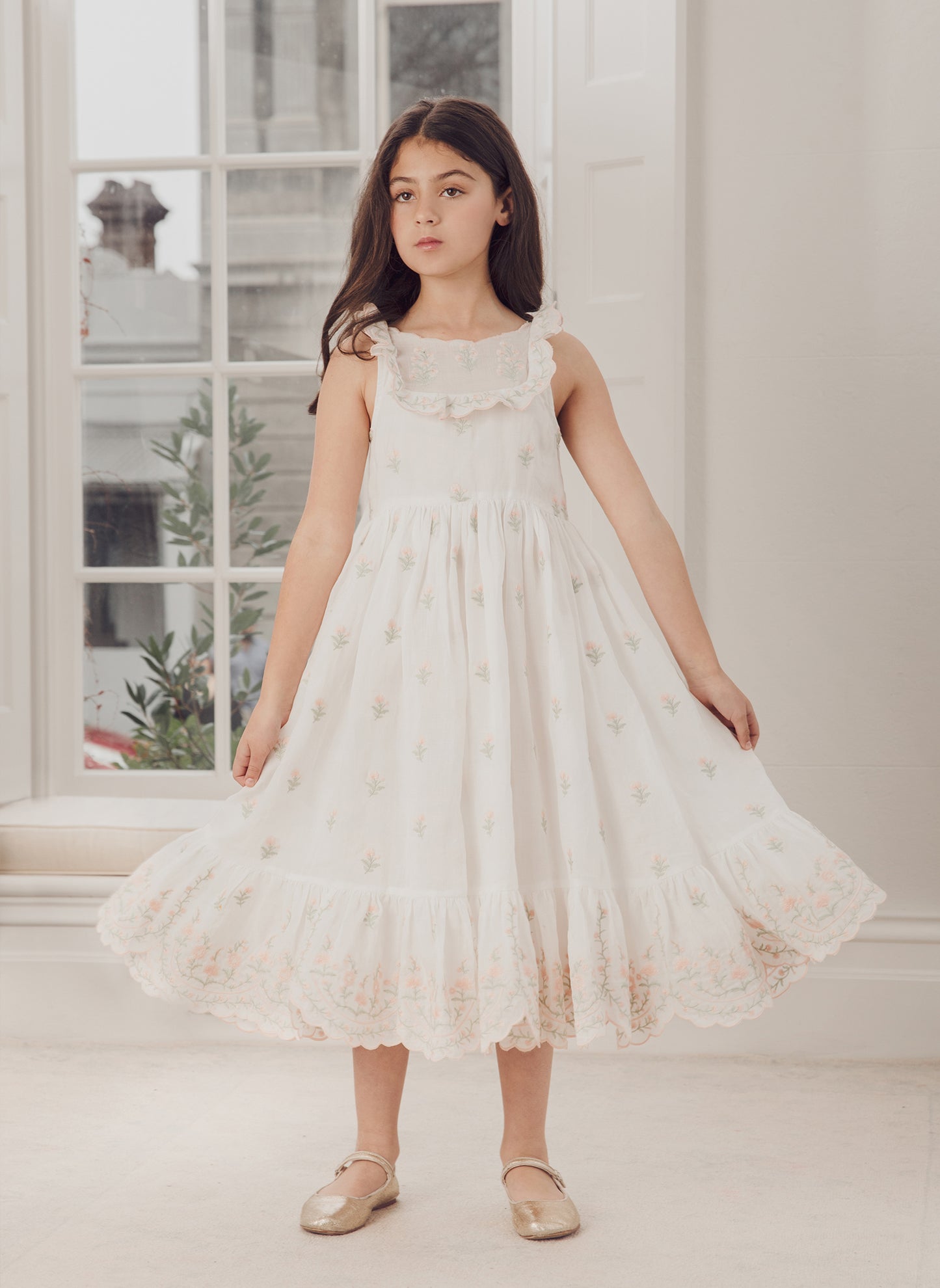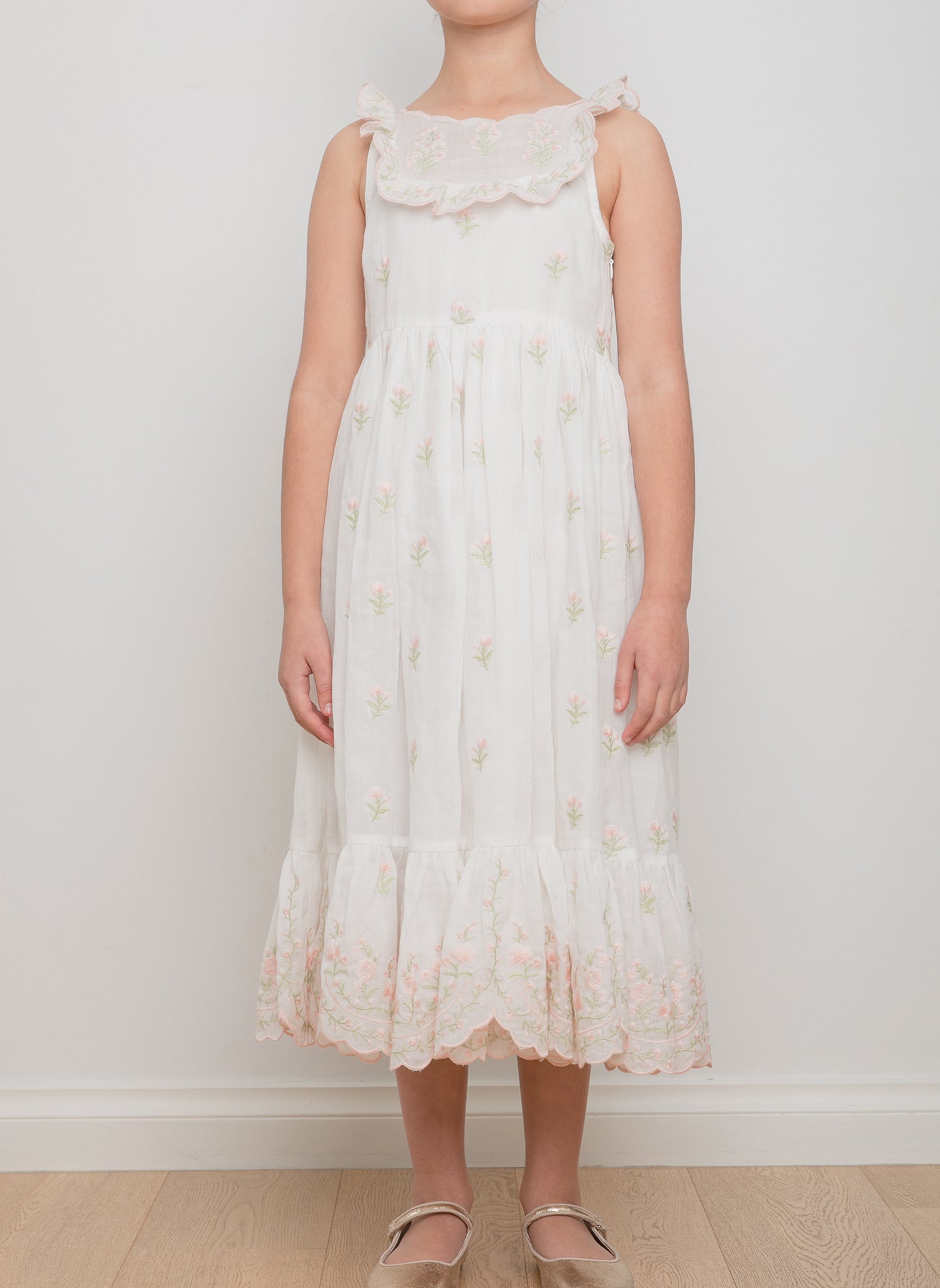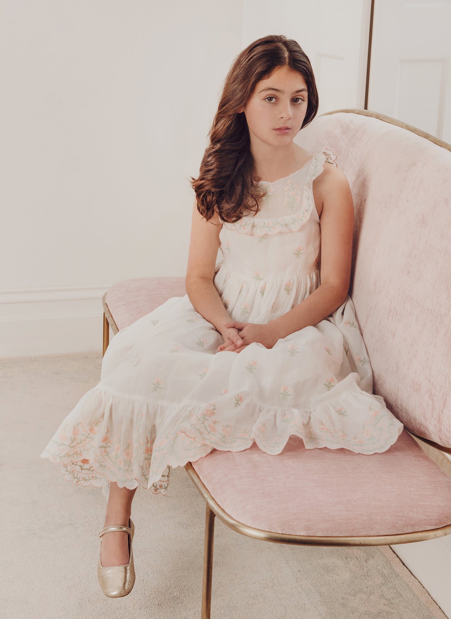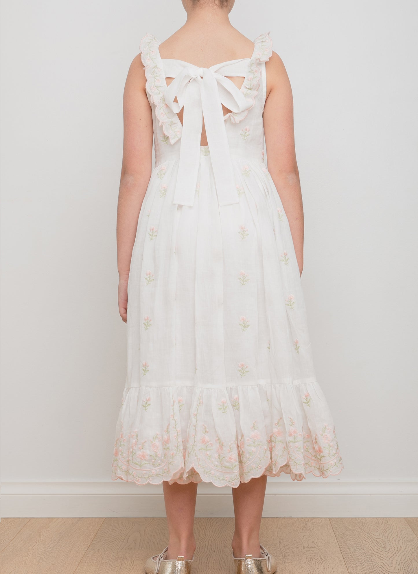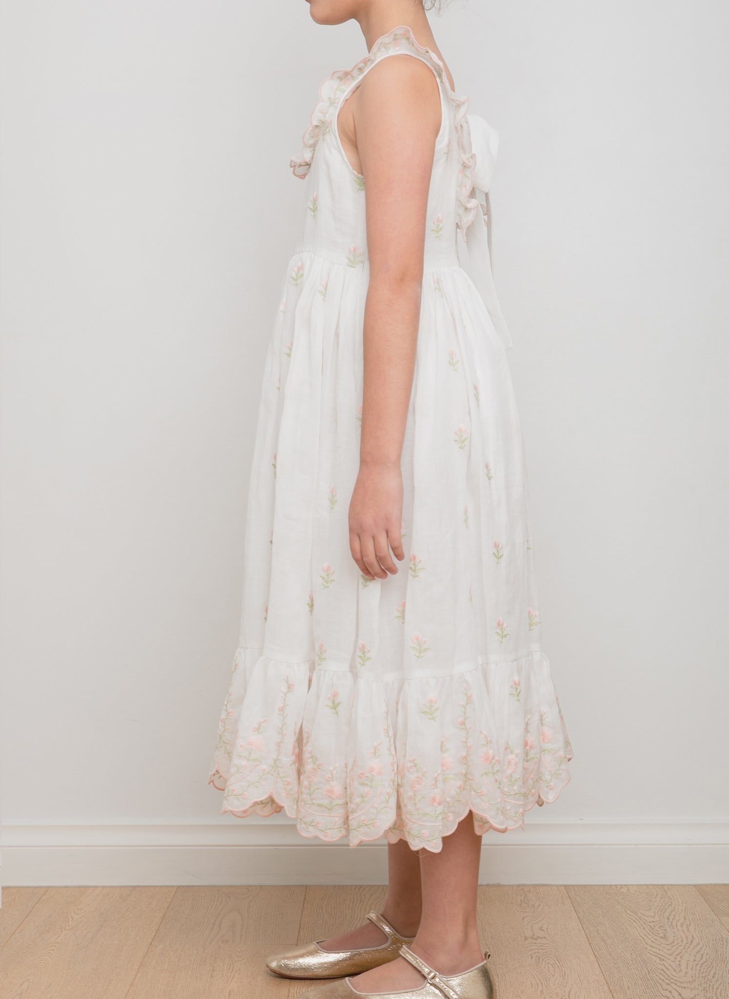This delicate dress is truly beautiful. Made from sheer linen and features all-over rose embroidery and intricate hem embroidery border detail. The bust is fitted and the skirt is full and finishes at mid calf. The back is scooped and features a self tie. A truly magnificent dress.