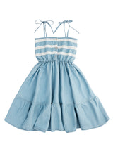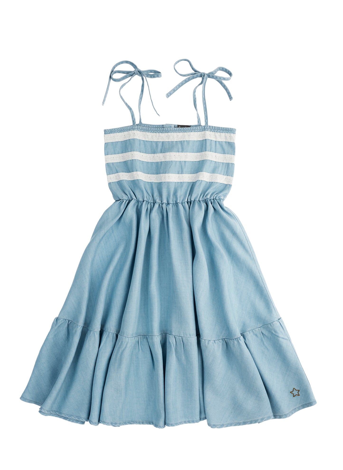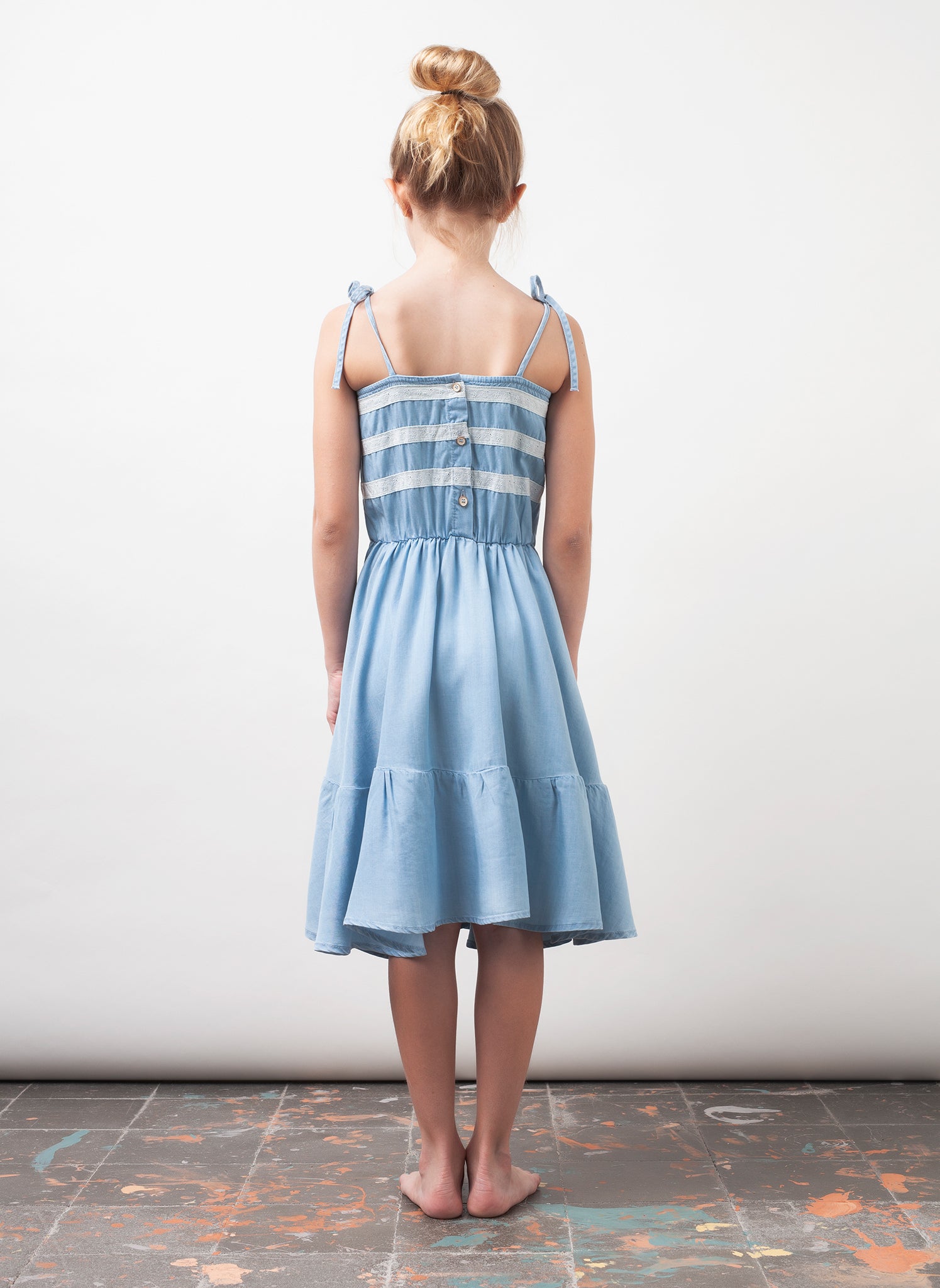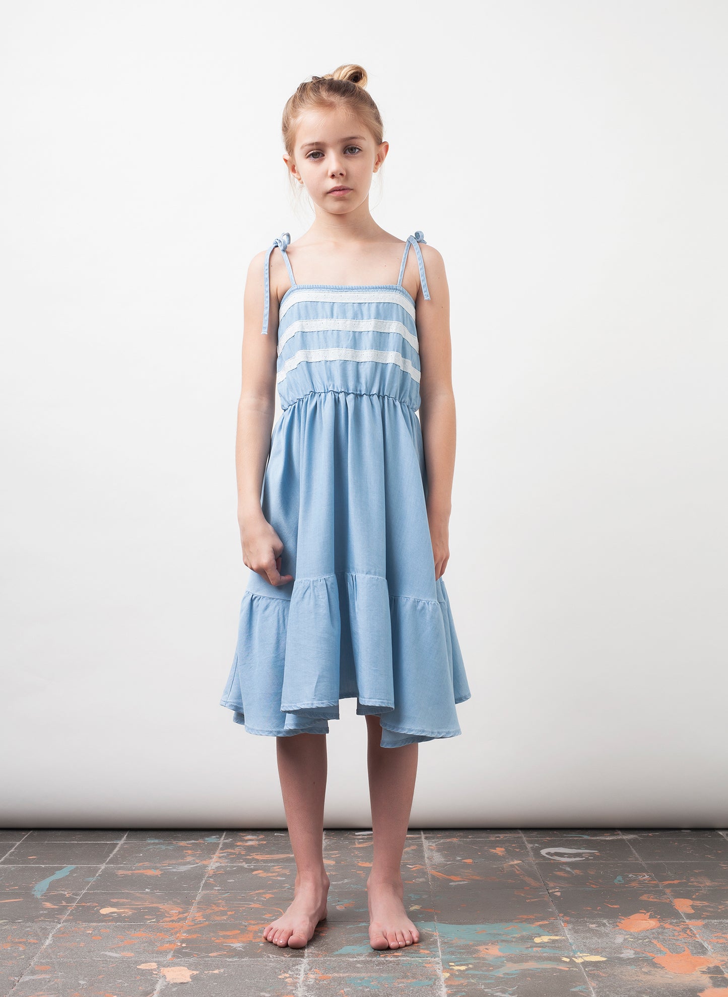 tocoto vintage's Chambray and Lace Girls Midi Dress is a beautiful and easy to wear spaghetti strap girls dress made in soft, light blue denim and featuring white lace details and a tiered skirt. Tie straps can be adjusted to the preferred length.