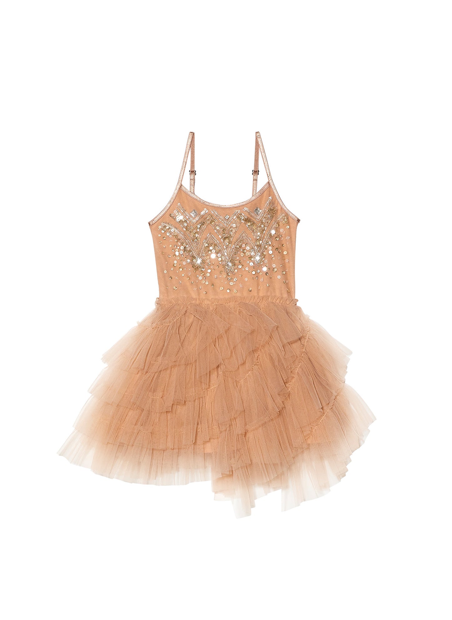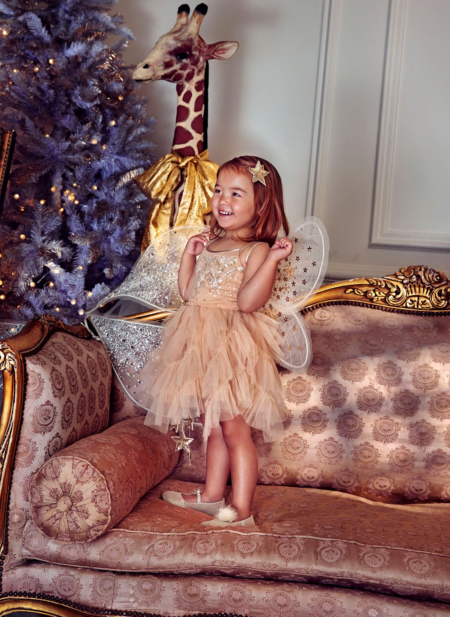 Happy days are here again! The dazzlingly adorned bodice of the Bébé Joyeux Tutu dress in Gumut will give her something to sing about this festive season. Featuring domed peaks of sequins and luscious pearls, this magical masterpiece also features stunning shoulder ruffles, and a full skirt of cascading layers of opulent tulle.