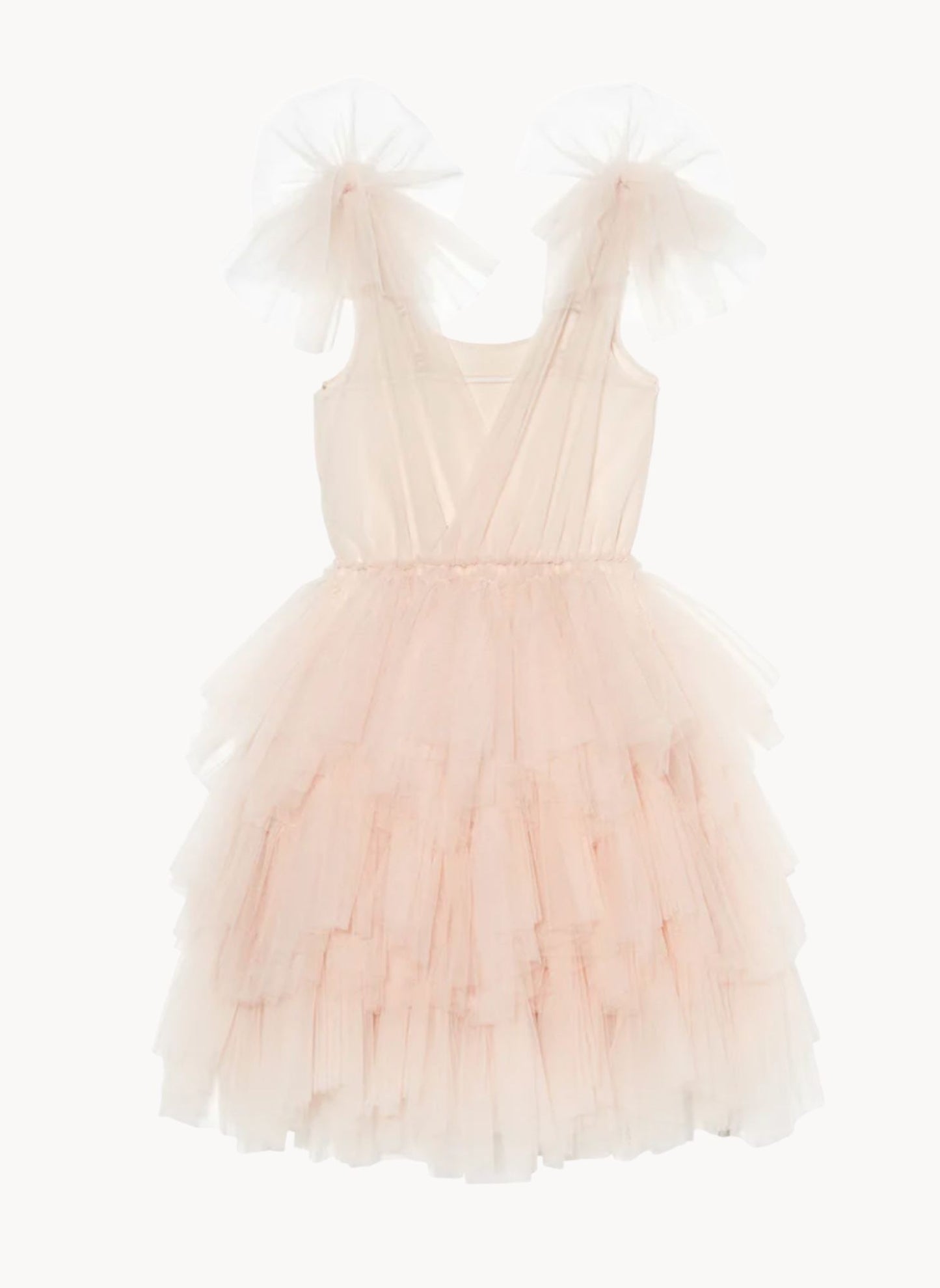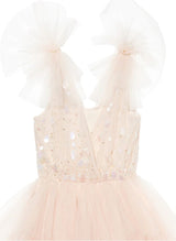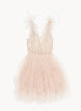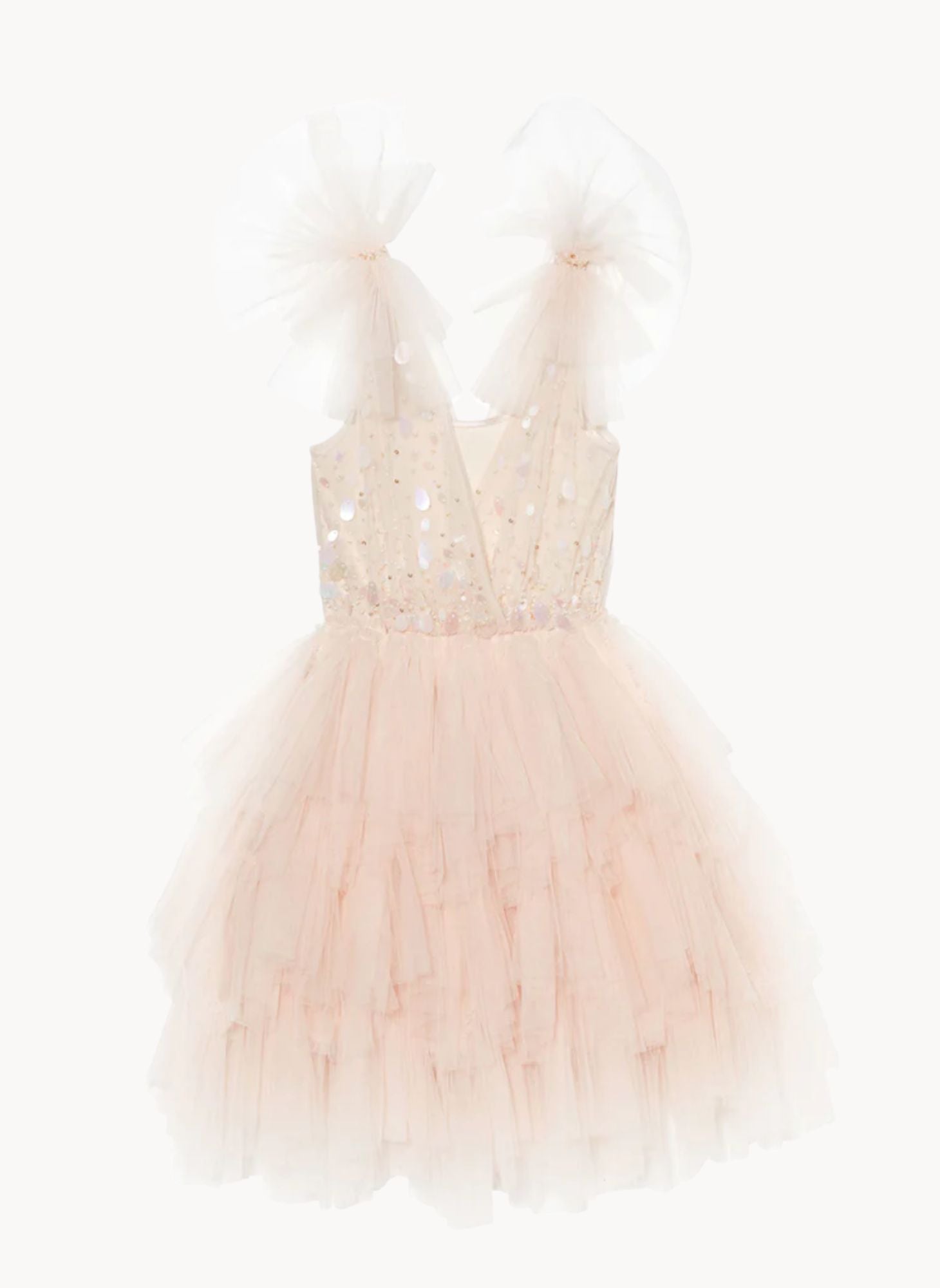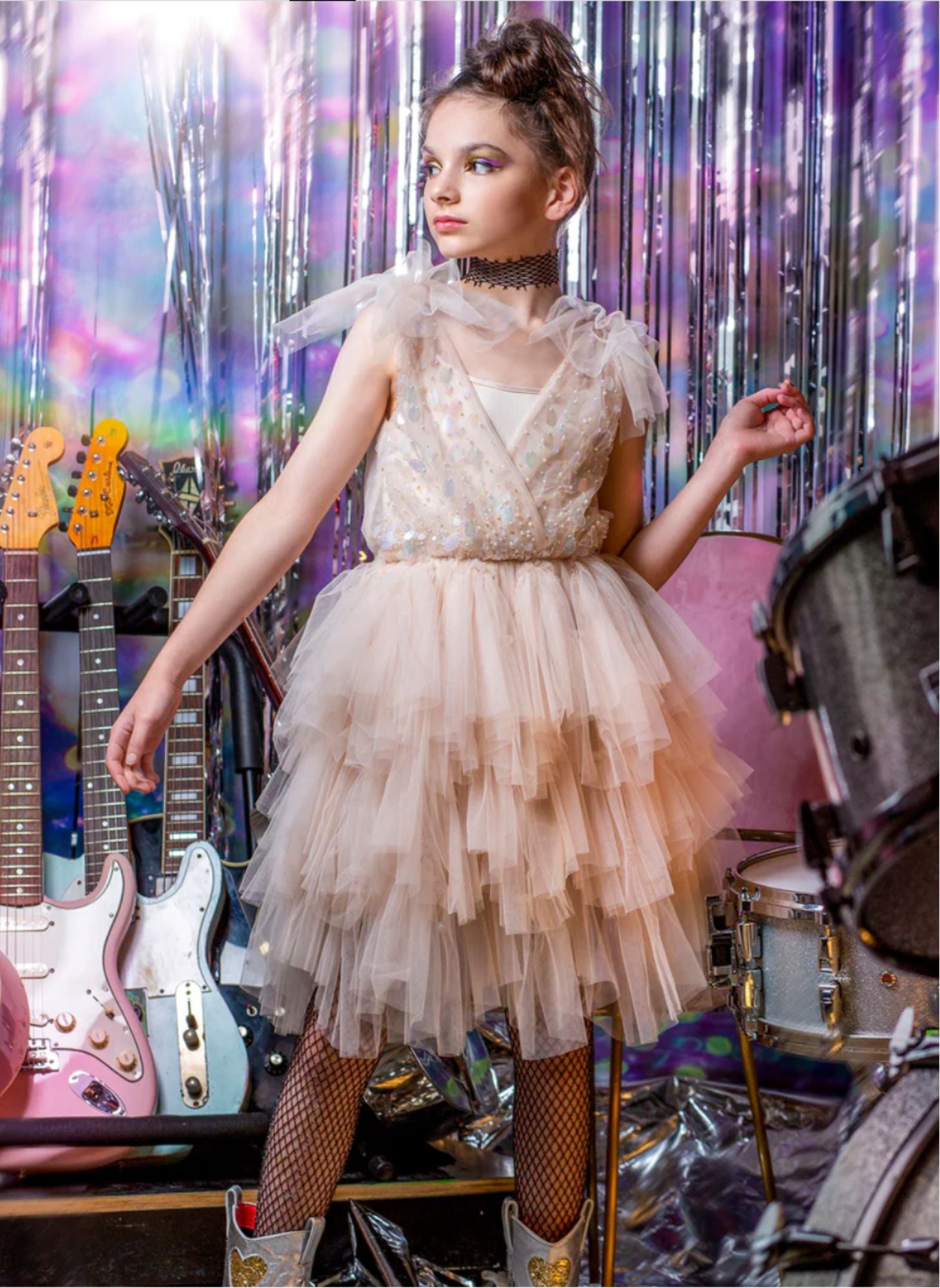 She'll be a heartbreaker in the Heart Of Glass Tutu Dress. Featuring a plunging crossover bodice studded with hand-sewn crystal-like shimmering sequin discs, and fun and floaty shoulder ruffles, this showstopper has plenty of heart. The voluminous layers of tulle ruffles in the full skirt add drama, so she's sure to lose her heart.